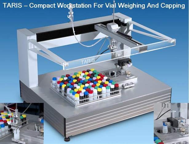 Stazione robotica automatizzata per la taratura e la pesatura di vial dalle varie dimensioni. Integrabile con capping e decapping automatizzato e lettore codice a barre. La stazione è stata disegnata per lavorare 100-200 vial a corsa, mantenendo un tempo di processo di 1 min a vial (rimozione del tappo, lettura del codice a barre, pesatura e riposizionamento del tappo).